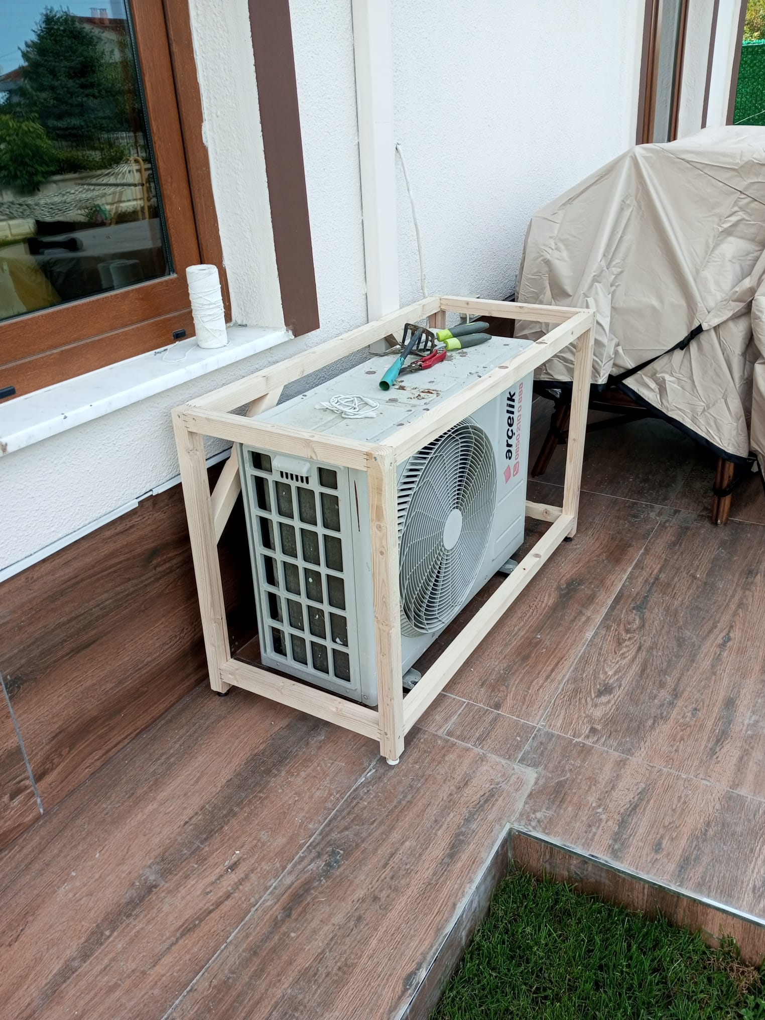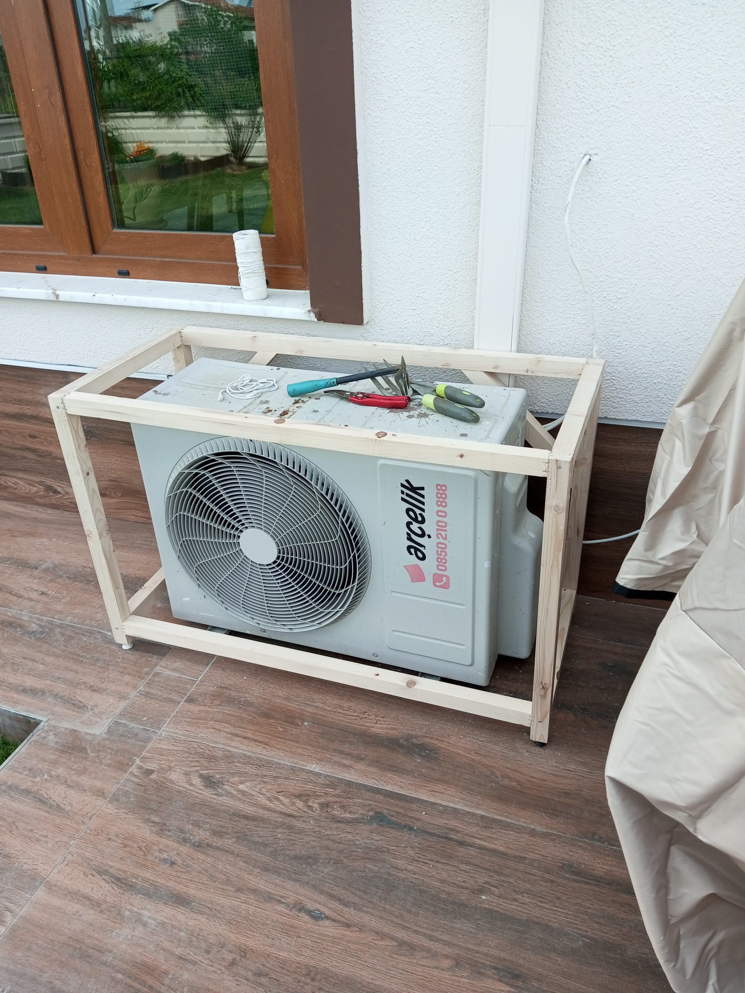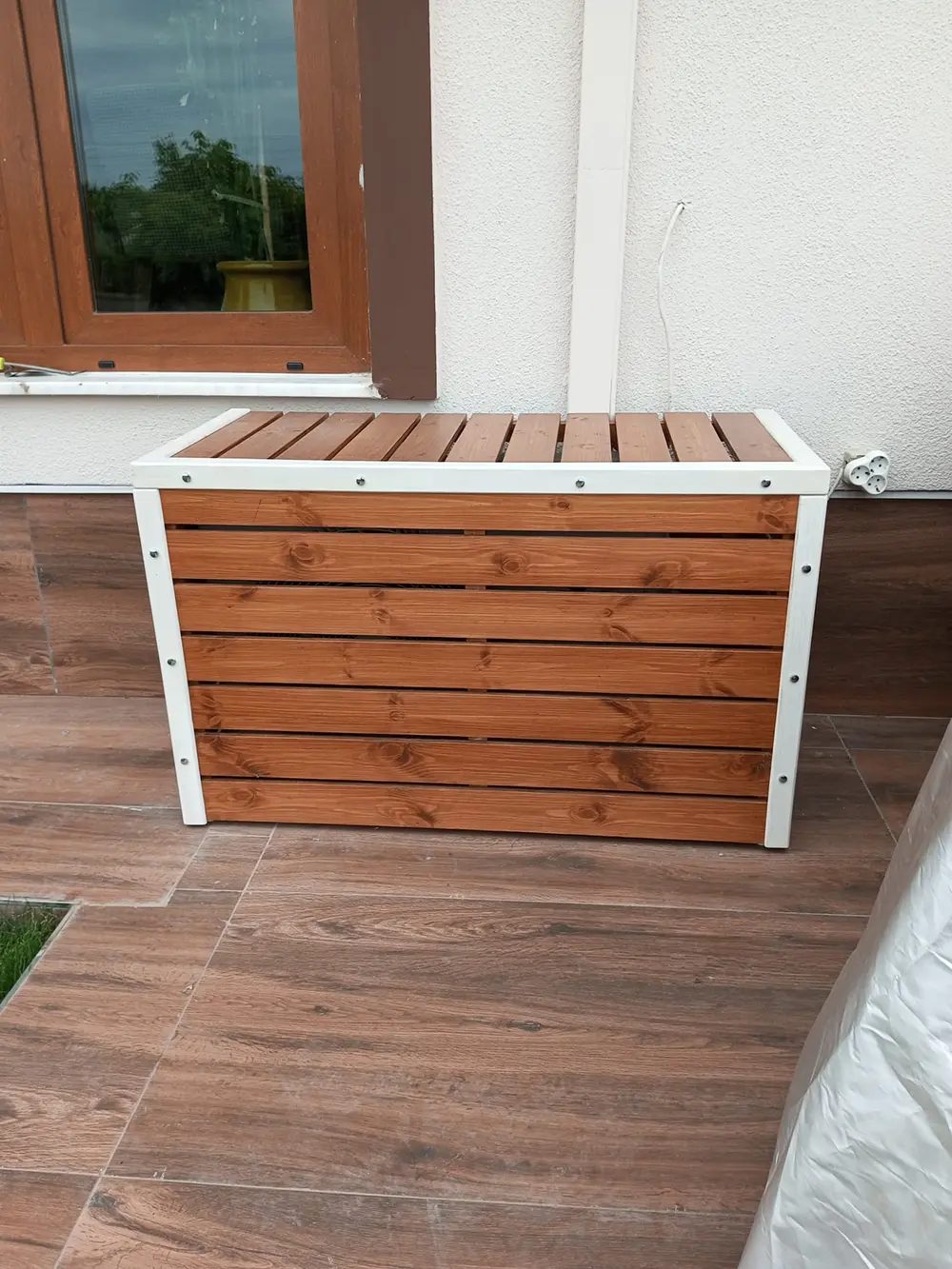 İthal çam ağacından tik rengi su bazlı vernik ile boyanmış portatif klima motoru kabini.