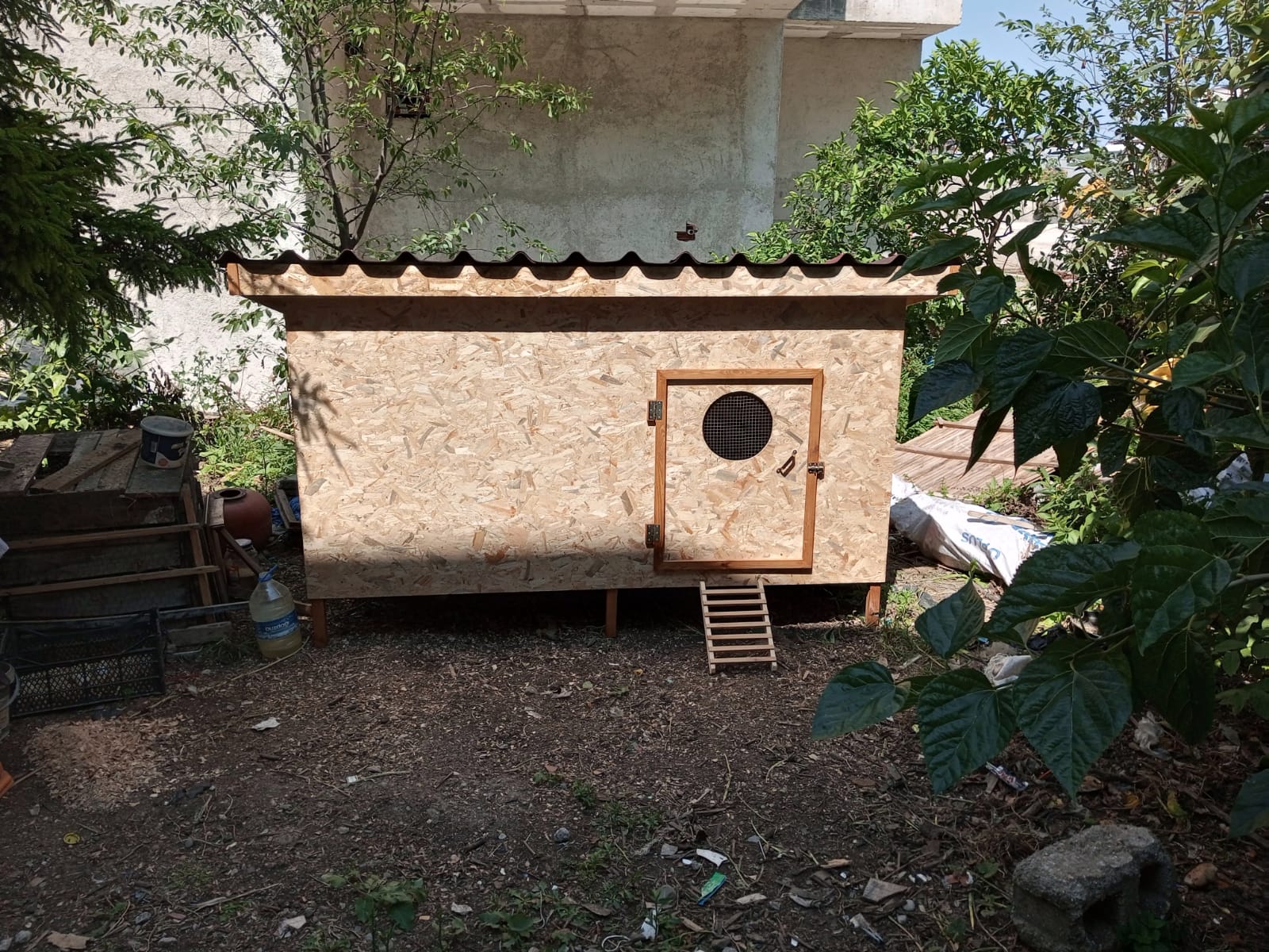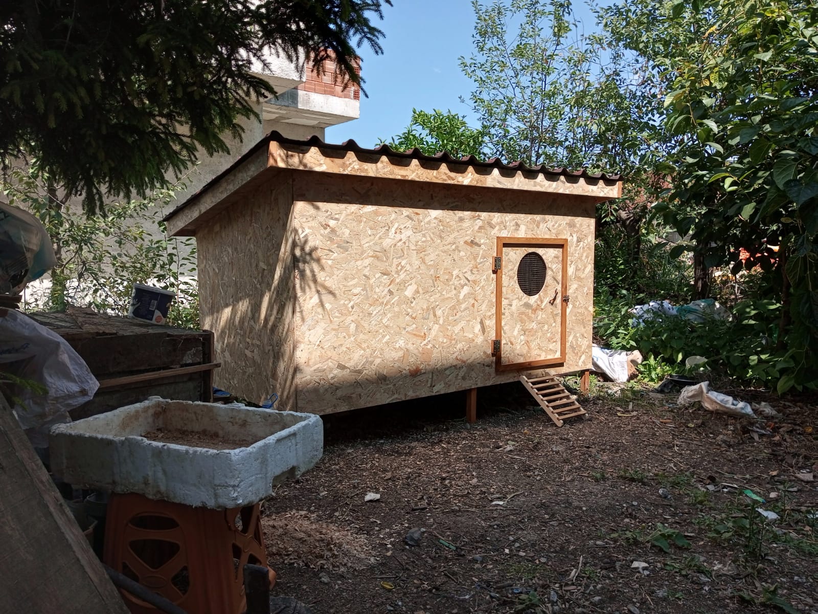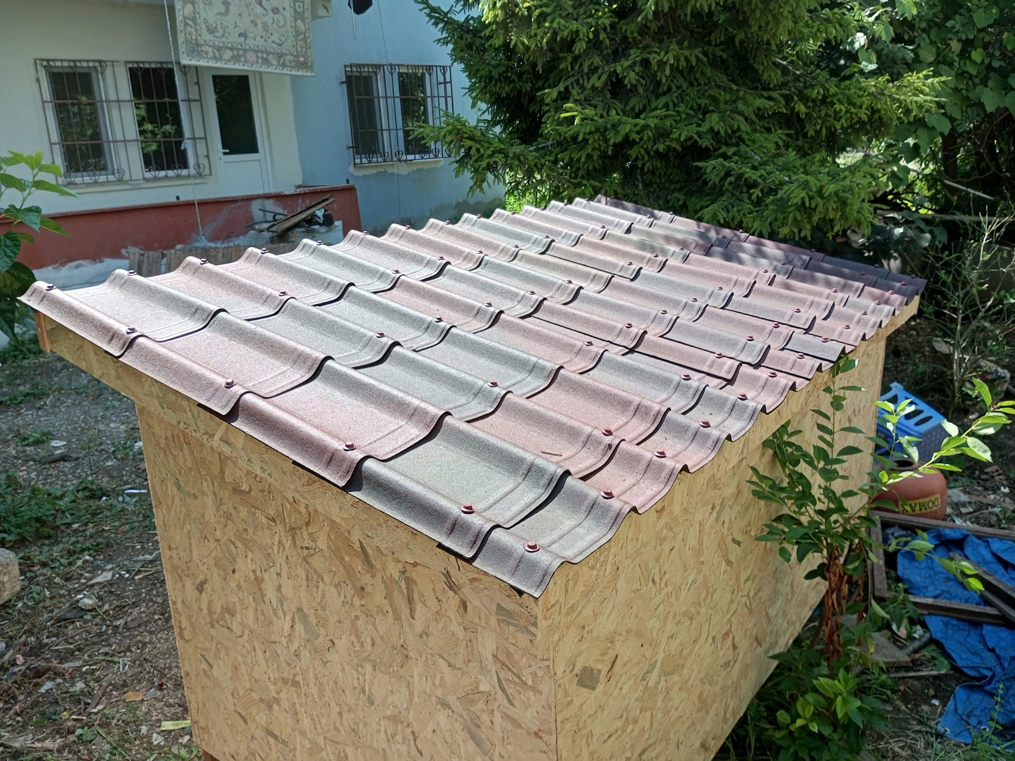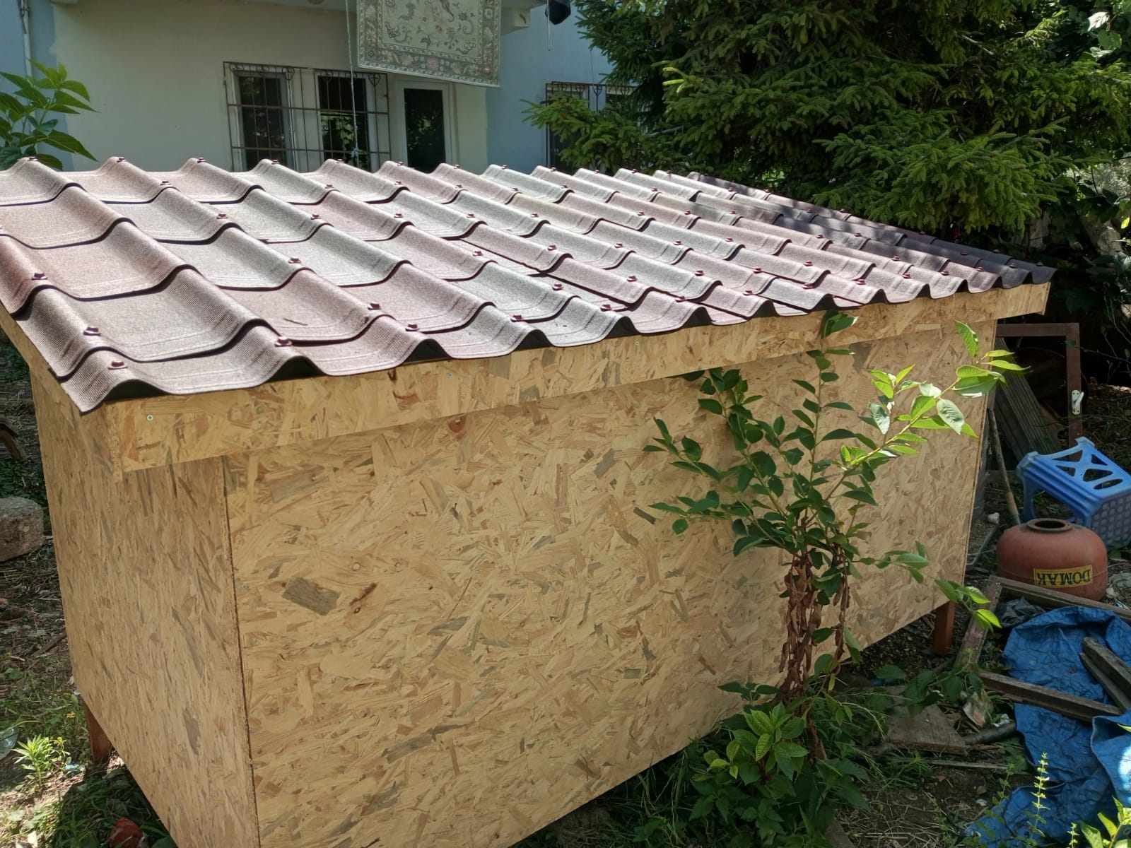 120×120×240 cm ebatlarında OSB plakadan çatısı Onduvilla kaplı tavuk kümesi