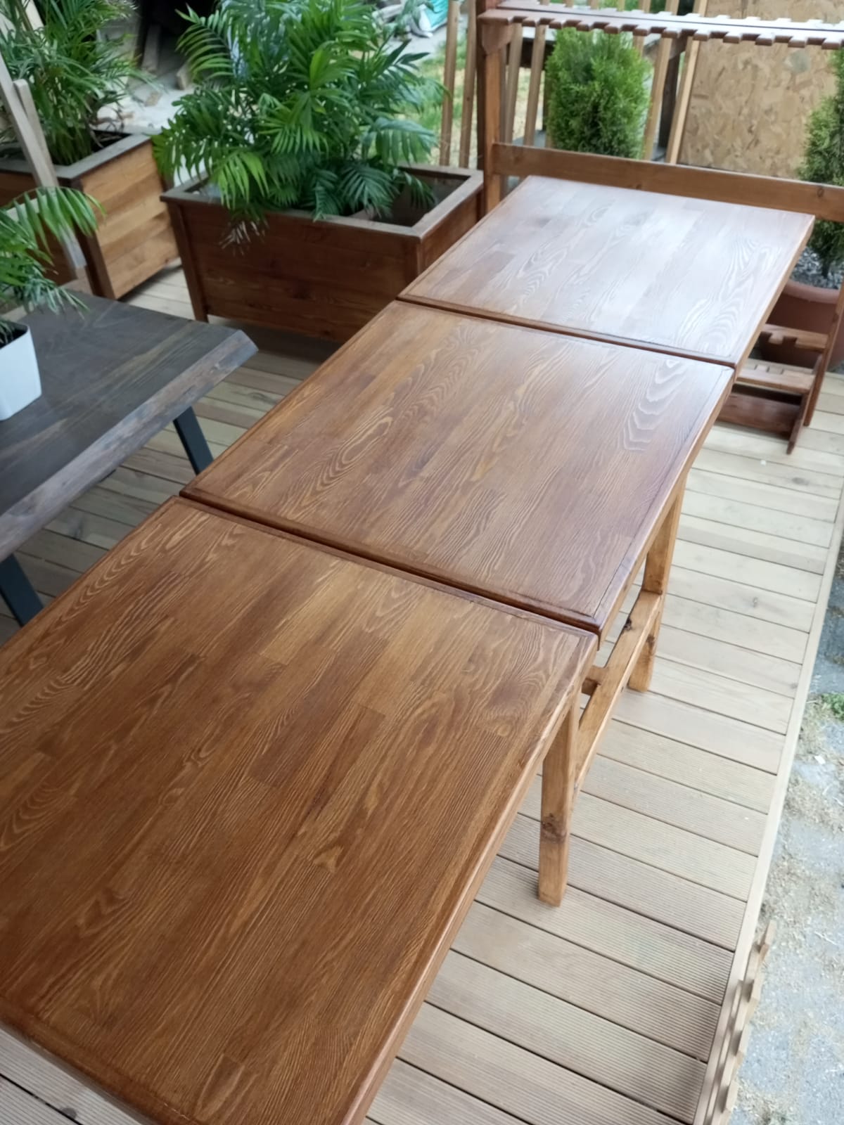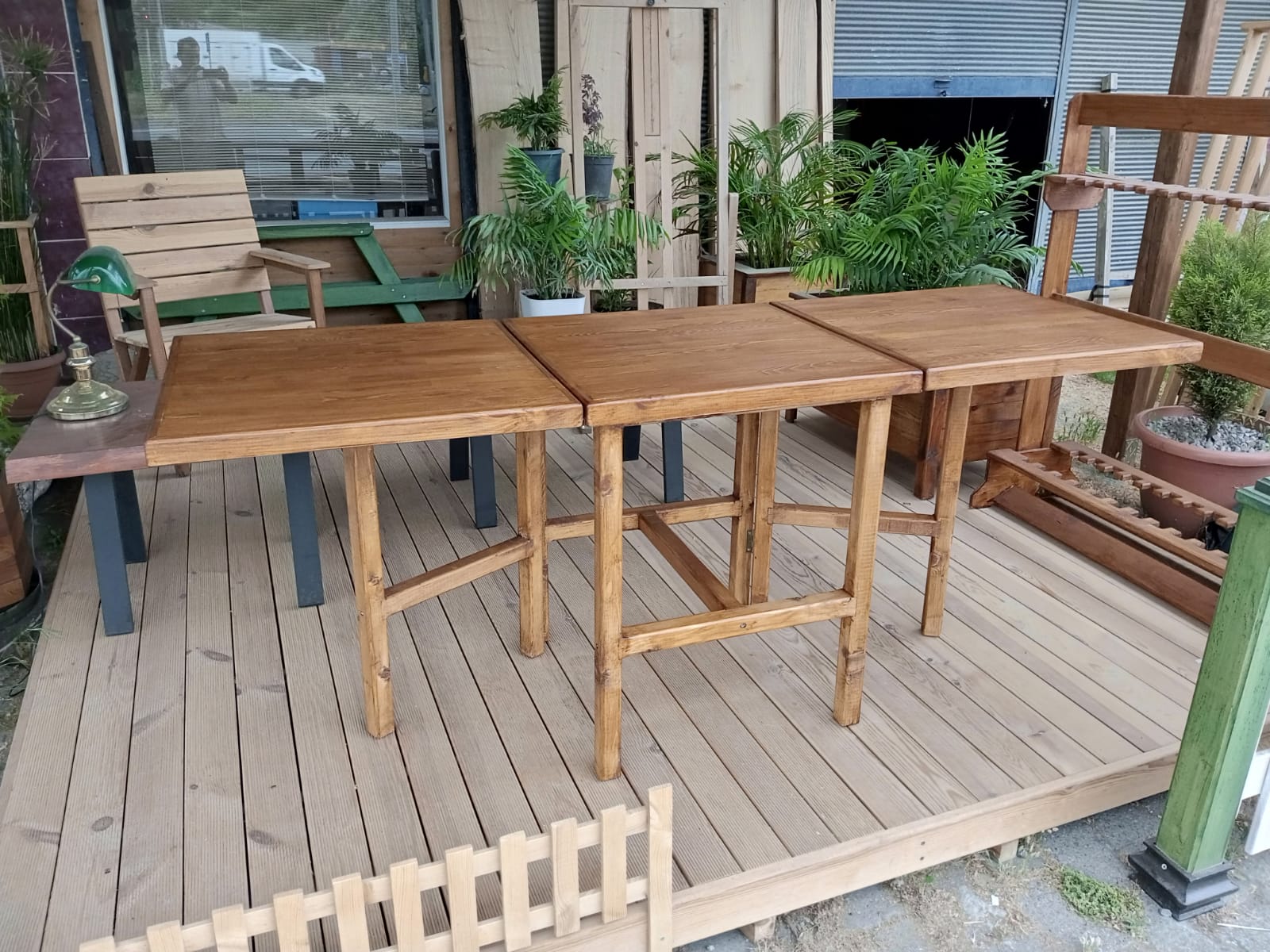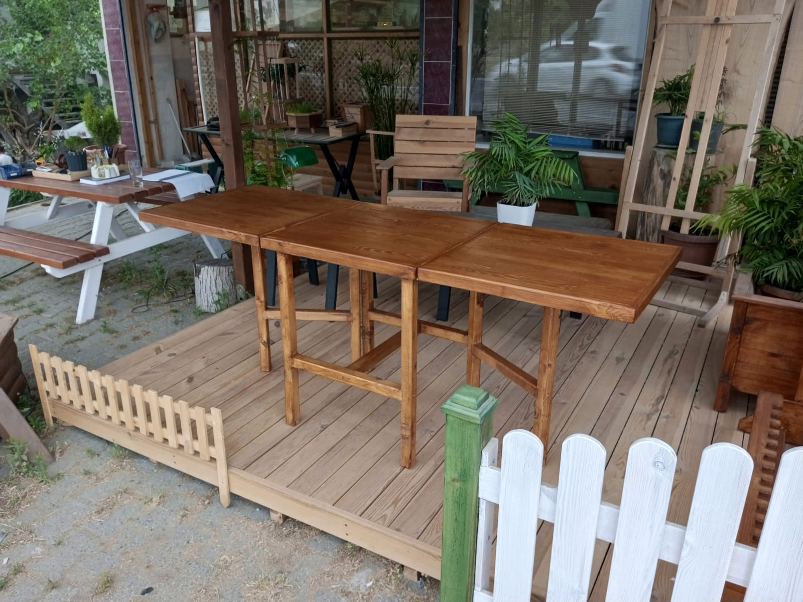 60 x180 cm ebatlarında, tablaları masif panelden, ayakları sarıçamdan tik rengi katlanır masa