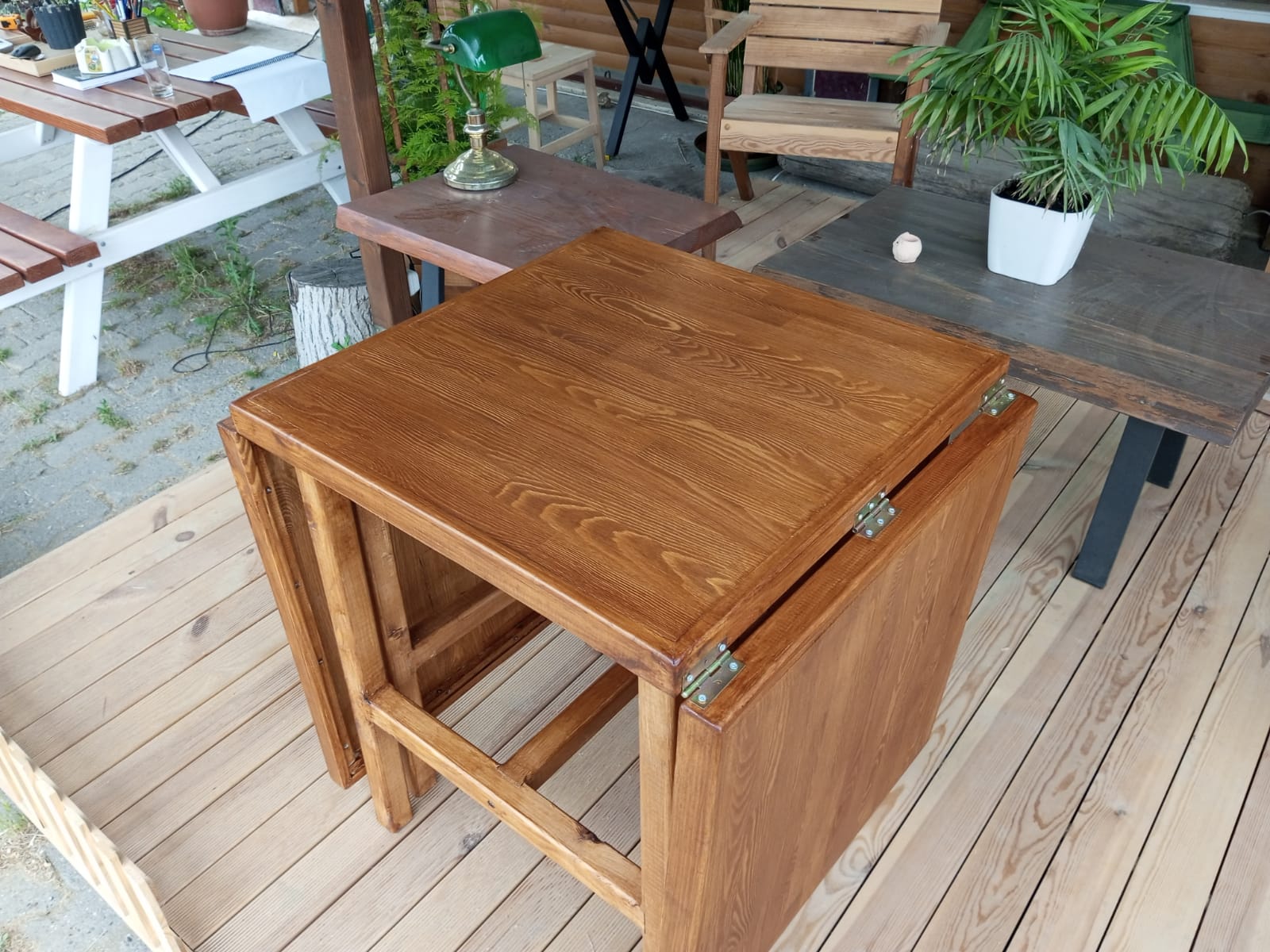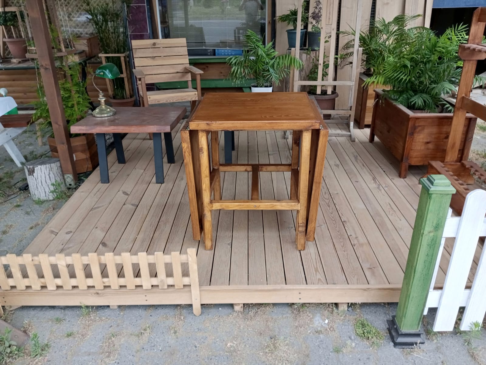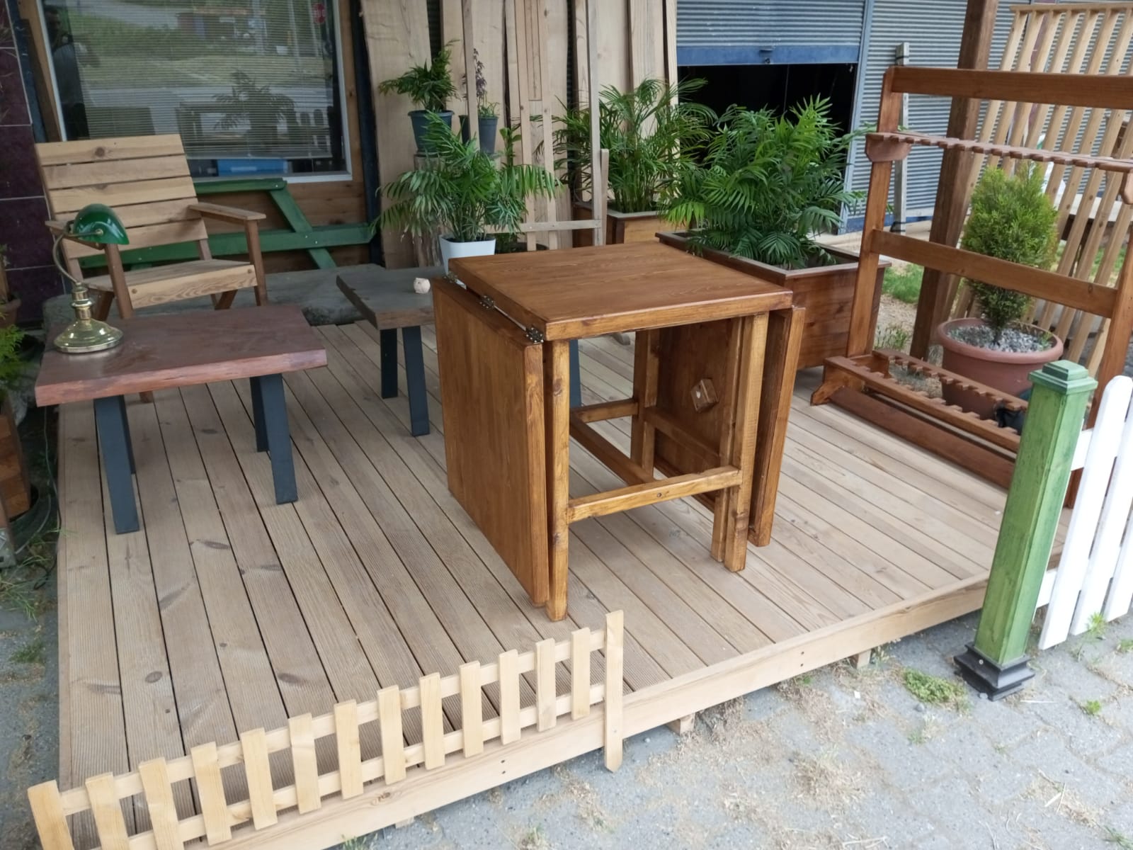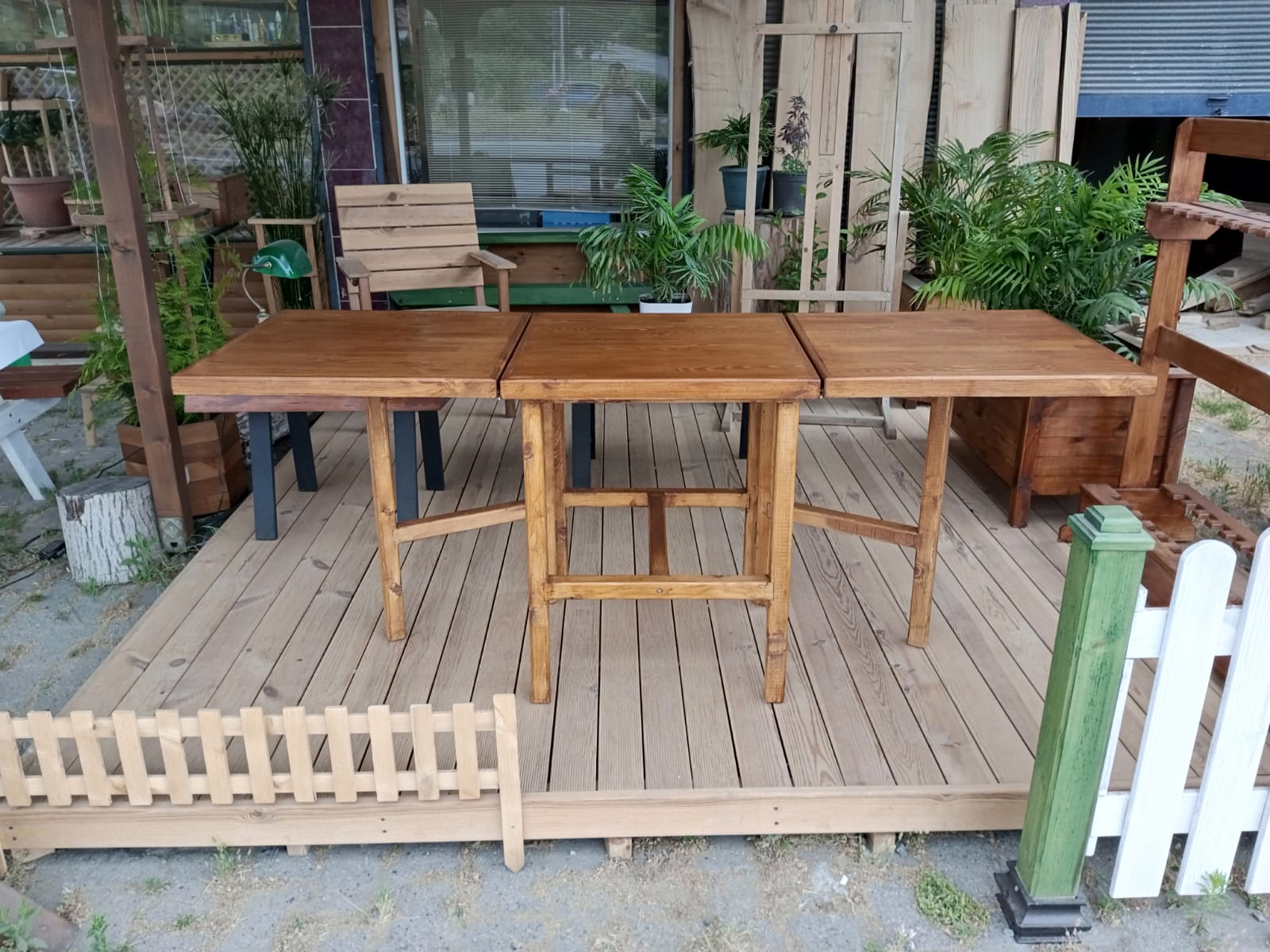 60 x180 cm ebatlarında, tablaları masif panelden, ayakları sarıçamdan tik rengi katlanır masa