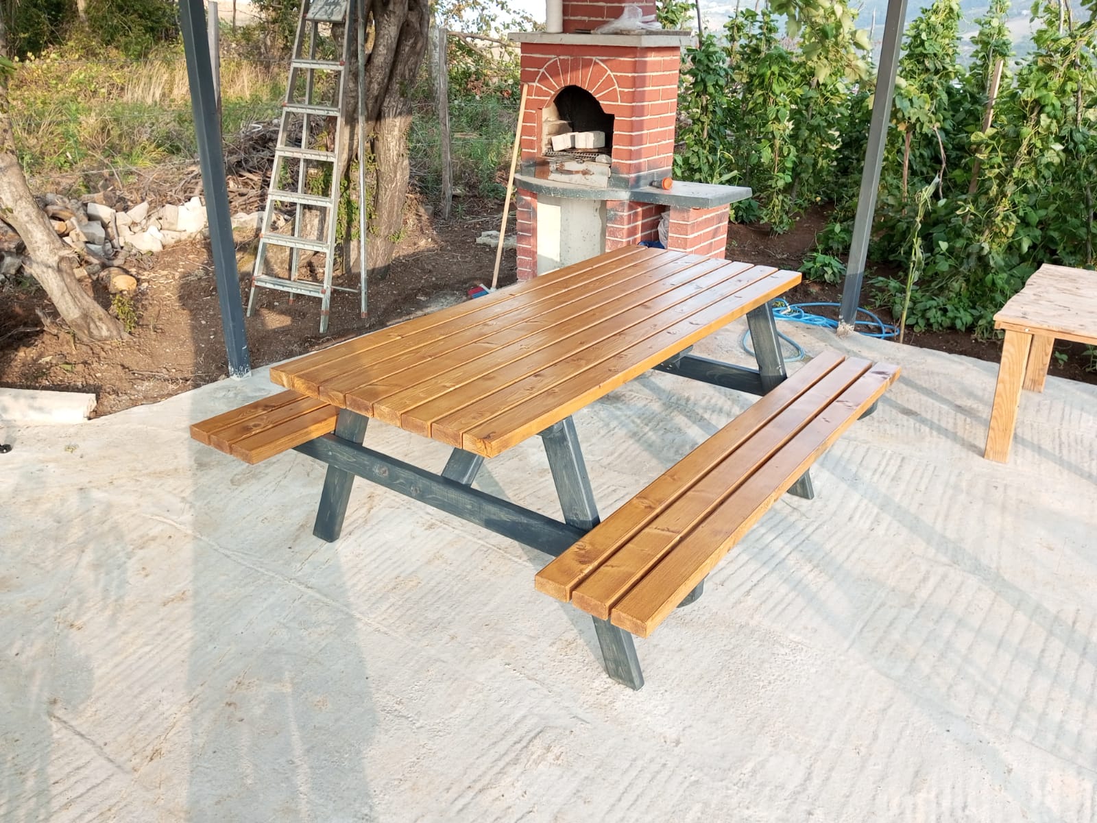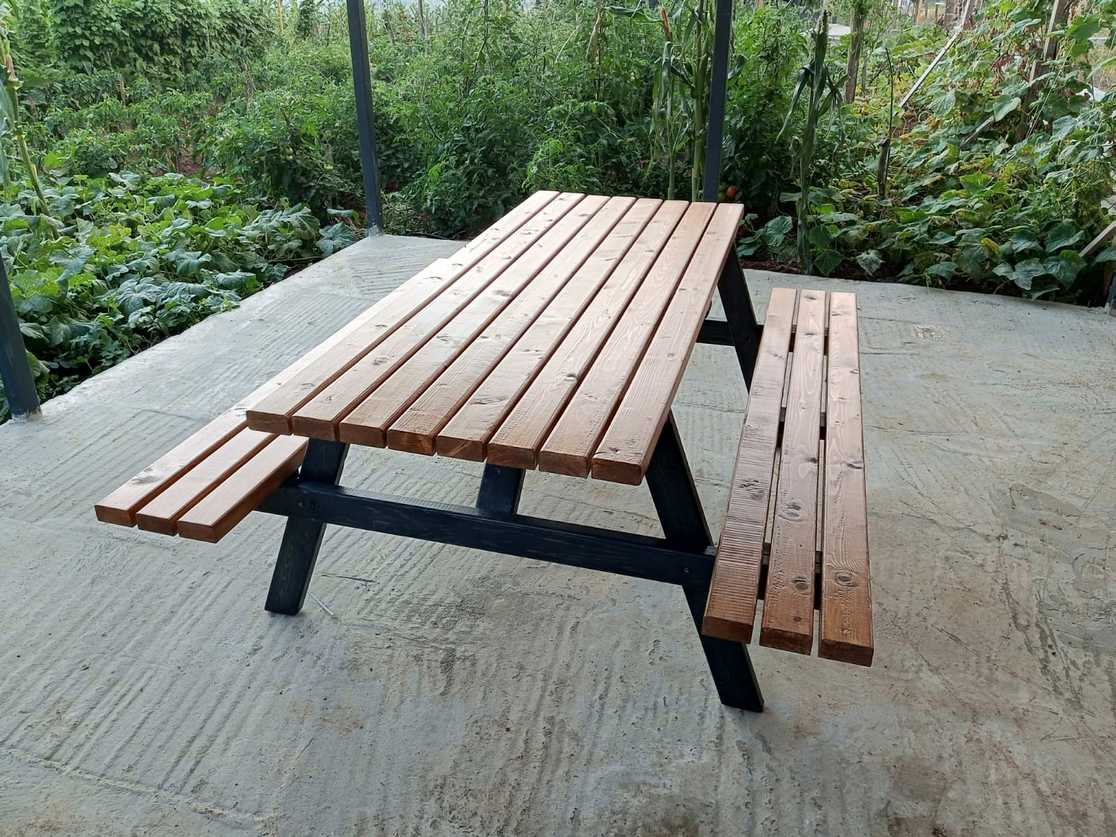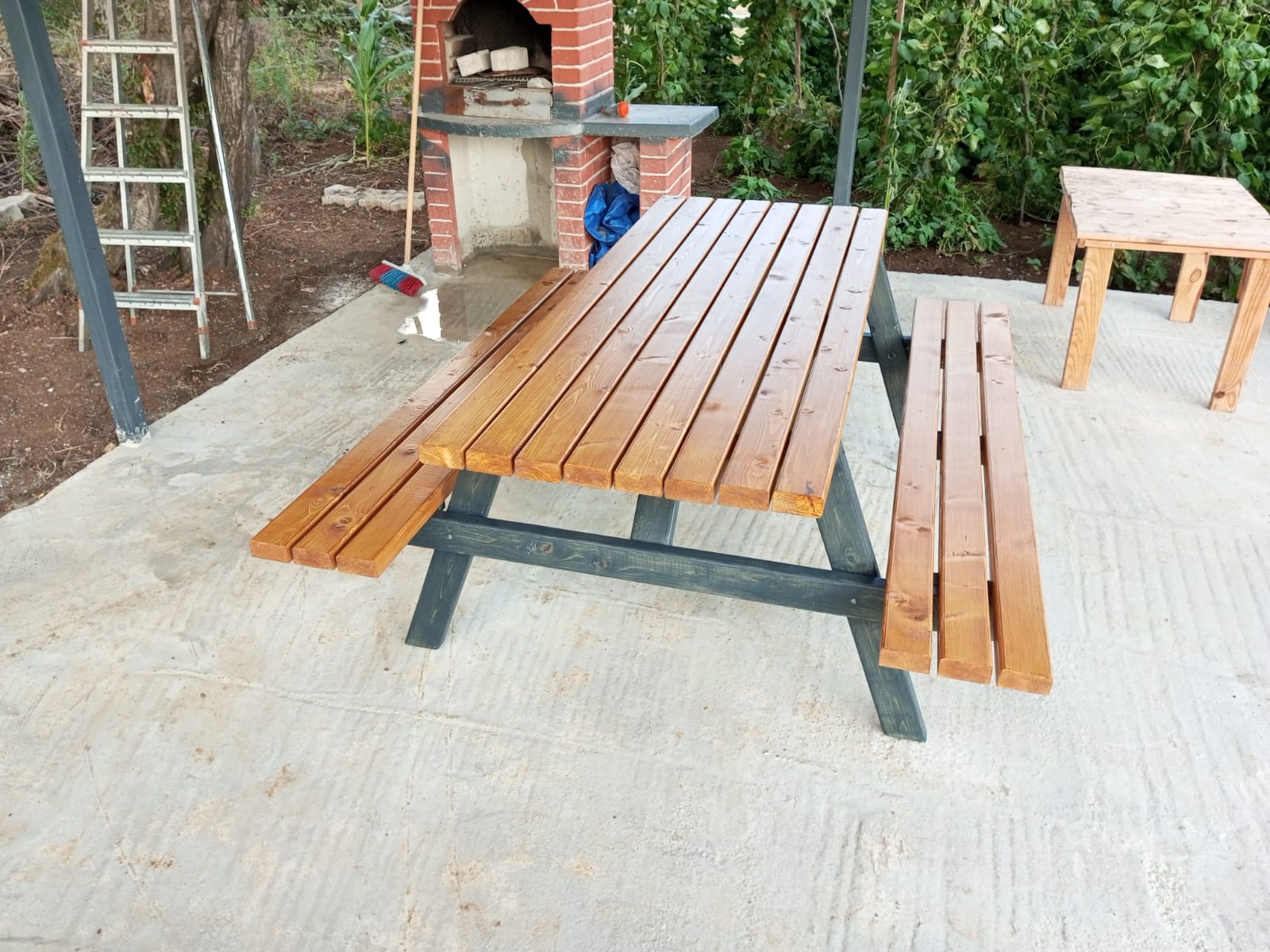 180cm uzunluğunda antarasit ve bal rengi vernikli köknar ağacından piknik masası.