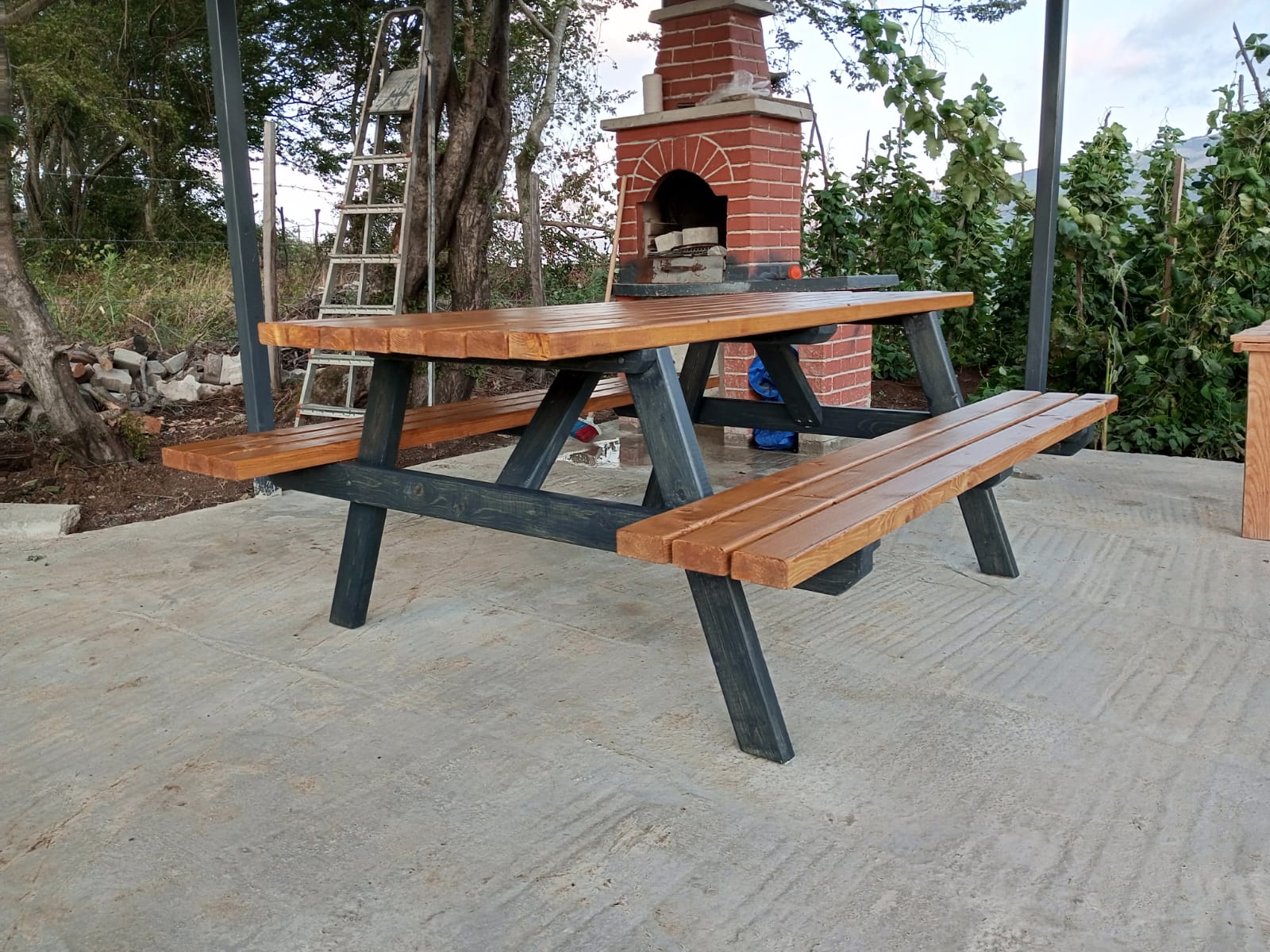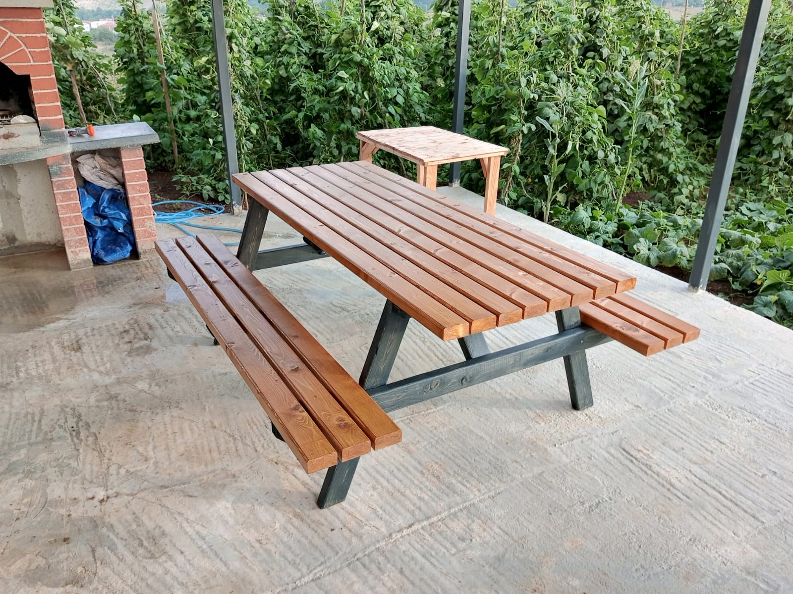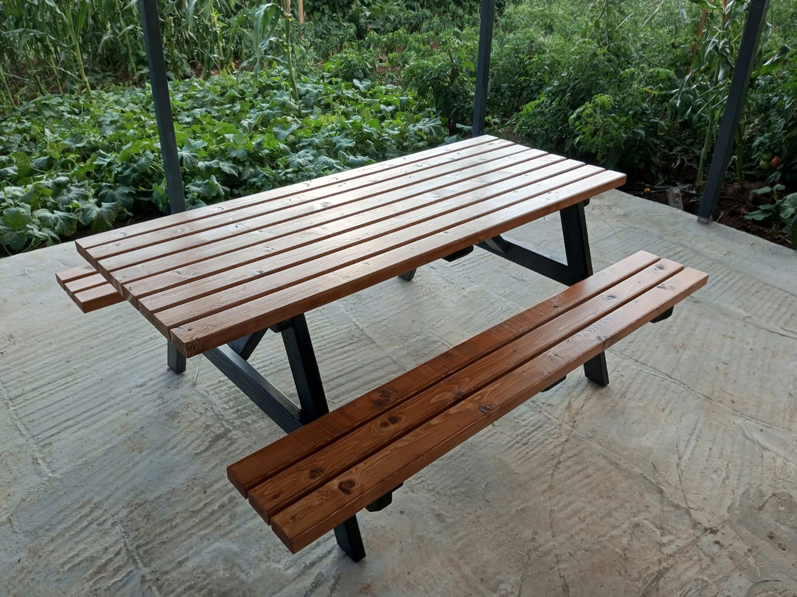 180cm uzunluğunda antarasit ve bal rengi vernikli köknar ağacından piknik masası.